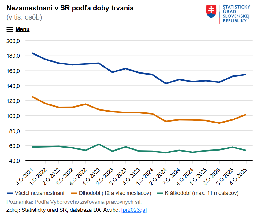 Štatistický úrad Slovenskej republiky zverejnil údaje o nezamestnanosti za 4. štvrťrok 2025 a za celý rok 2025. Podľa správy sa miera nezamestnanosti v závere roka zvýšila a dosiahla 5,6 %, pričom celková ročná miera nezamestnanosti bola 5,4 %.